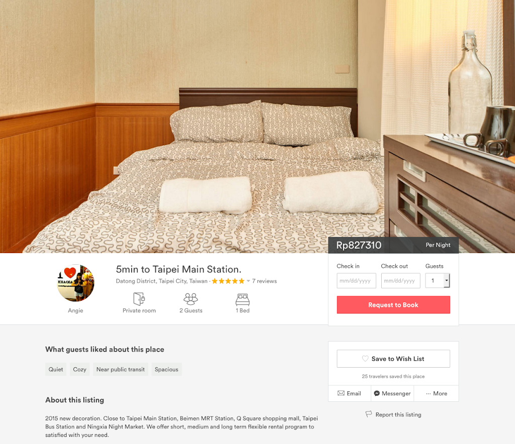 Setelah melihat-lihat pilihan yang ada, saya tertarik memesan kamar privat di apartemen ini: https://www.airbnb.com/rooms/6405228. Lokasinya dekat dengan Taipei main station dan harganya tidak terlalu mahal. Tidak lupa saya cek profil host-nya, tampak meyakinkan kok 🙂